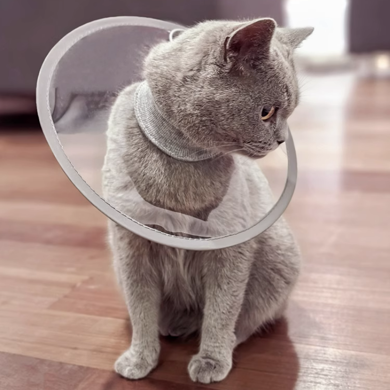 confort et visibilité: légère et confortable, fabriquée en PVC transparent permettant de voir sans bloquer la vision, conçue pour réduire l'anxiété et faciliter les mouvements; conception pour l'alimentation et mobilité: surface plate circulaire qui permet de manger sans gêne; matériaux et durabilité: principale matière en PVC transparent, structure interne avec fil d'acier plat et élastique, partie au cou en coton gris à haute élasticité, imperméable, facile à nettoyer, pliable et résistant; sécurité et ajustement: bordure anti-collision pour protéger l'animal et les meubles, bordure réfléchissante pour visibilité nocturne, boucle/fermoir à cordon pour ajustement personnalisé